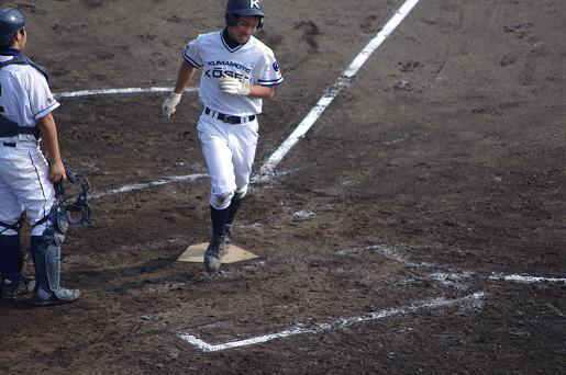 yasuはエンドランのまま1塁から長駆ホームイン。高専八代貴重な勝ち越し点。笑顔を見せるkuwa。