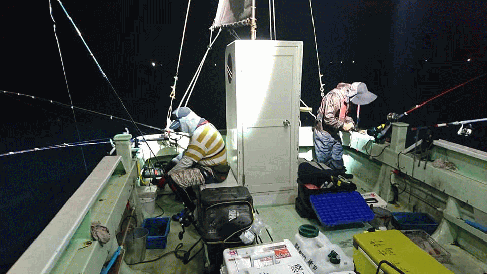 豊後水道の海中を写した二枚の青い幻燈です。 烏賊というしたたかなな生物がいる。ある科学者たちの説では2億年後の地球を支配するであろうと考えられている生物である。あらゆる環境の中でも対応できる彼らは、早く動き回るために心臓が3つあるという。 足が8本、2本の長い腕で魚を捕食する。時速40kmで泳ぐことができるエネルギッシュな烏賊。そいつが食べておいしいとなれば(それどころか冷凍しておくとさらに甘味が増しておいしくなる)釣り人も釣りの対象魚として放っておく手はない。 その最高のターゲットの烏賊が人気対象魚として一気に注目を集める時期がある。それは夏である。そして、その時期に九州で乱舞するのは、イカの中でも最上級に美味と言われるケンサキイカ(アカイカ)である。 毎年夏になると、磯釣り師は鮎師になったり、夏磯の夜釣りへと転身したりする輩がいるが、烏賊をターゲットにした「にわか船釣り師」もかなりの数いると聞く。釣り人の間では、もうすっかり夏の風物詩として定着している。 色や形、サイズの様々な種類がある浮きスッテを枝スにつけて、タナ取り、誘い方を工夫しながら楽しむイカ釣りはかなり奥が深い。最近では、数釣りよりもゲーム性を求め、鉛スッテ(イカメタル)を使った釣りも人気とのこと。 そして、牛深沖では朝まずめ限定で、イカの泳がせというエキサイティングな釣りもできる。イカの生き餌で、(そこにいれば必ず魚が食らいつく)大型の真鯛やブリなどの青物が釣れるという。この釣りには夜が明けてからのモンスター狙いというオプションもあるのだ。 自分もなんとしてもやってみたいと興味をもっていたところに、元Q大の先生だった忠太郎さんから誘われ、イカ釣りの面白さを知ってしまったからタマラナイ。今回も1年前から予約していた。 ところが、PTA関係の行事が後から入ってしまい。涙をのんで忠太郎さんとの釣行を断念した。釣行の断念を決定したが、納得いかない自分がいた。どこかにイカ釣りに行ける時間はないものか。 熟慮の末、8月16日からの夜釣りならば、なんとか釣りができそうである。時間と資金と家族の了解は取り付けた。あとは、遊漁船である。 そんなとき、最近ブリ釣りなどでお世話になっている遊漁船「松風」さんから、こんなメールをもらった。 イカ釣りの空席状況です。・・・8月16日2人空き・・・ えっ、今7月初旬なのに、すでに8月の土日はうまっており、平日である16日もあと2人とは。豊後水道でこれだから、甑島方面はおそらく空きはないだろう。反射的に松風さんに連絡を取り予約を入れた。 最後の関門は、台風である。今年は、箱根や函谷間(かんこくかん)のように前途は険しかった。7月より次から次に台風が生まれ、特に8月12日から5日間連続で台風が発生した。15号が宮崎県に上陸し、日本海へと通過。16号はベトナムへ上陸。17号は、ハリケーンから日付変更線を超えて台風となって日本列島に近づいている。釣り前日の15日も18号が発生し、海をことごとく荒らしている。 これじゃどう考えても東シナ海側は無理。釣りができるとすれば、豊後水道だけだろう。こう考えて、諦め半分船長へ連絡をとった。 「出ます。4時45分に集合してください。」 「えっ、波は大丈夫なんですか」 どうやら、沖はうねりがあるものの、それは波長が長く、釣りができないほどの威力はないとのこと。これだけたくさんの台風の発生にもかかわらず出撃許可をもらったことに、驚きと喜び、戸惑いを感じながらも、いつの間にか鼻歌交じりに釣り合具の準備を進めていた。 松風の寄港地である佐伯港に到着したのが、午後4時。すでに釣り人は6人がスタンバイ。‘(この船の定員は8人)船長も軽トラックで登場。荷物を積み込みいざ出港だ。 船は定刻の5時に港を離れた。今年の日本列島は記録ずくめの猛暑が続いていたが、台風15号が通過してからは、暑さもややトーンダウン。空は鉛色の雲で厚く覆われている。湿気を含んだ潮風はこれまでの猛暑に耐えてきた肌には心地よく感じる。 さあ、初めての豊後水道のイカ釣り。どんなドラマが待っているのだろう。はやる気持ちを静めながら、からあげとおにぎりの軽い夕食をぱくつく。 舵は、沖に向かって左のブリ釣りのポイントではなく、カサゴ釣りのポイントでもない、両者の中間の方向に進んでいる。鶴見半島を右手に見ながら佐伯湾内を快走する松風。 鶴見大島の位置で佐伯湾口あたりに出たことが分かった。ここまでくると、決して高くはないが波長の長いうねりが現れ始めた。そのうねりを受け船は右に左に心地よく揺れながら前に進んでいる。 沖に出て、九州を背中にしょって進むようになると、船との遭遇が多くなった。その多くはどれも何かを運ぶ目的の船であり、それはどれも大型で、しかも右から左へ、あるいは左から右へと進んでいる。 ここまで沖に来ると、うねりが台風の影響であることがはっきりわかるような規模になってき